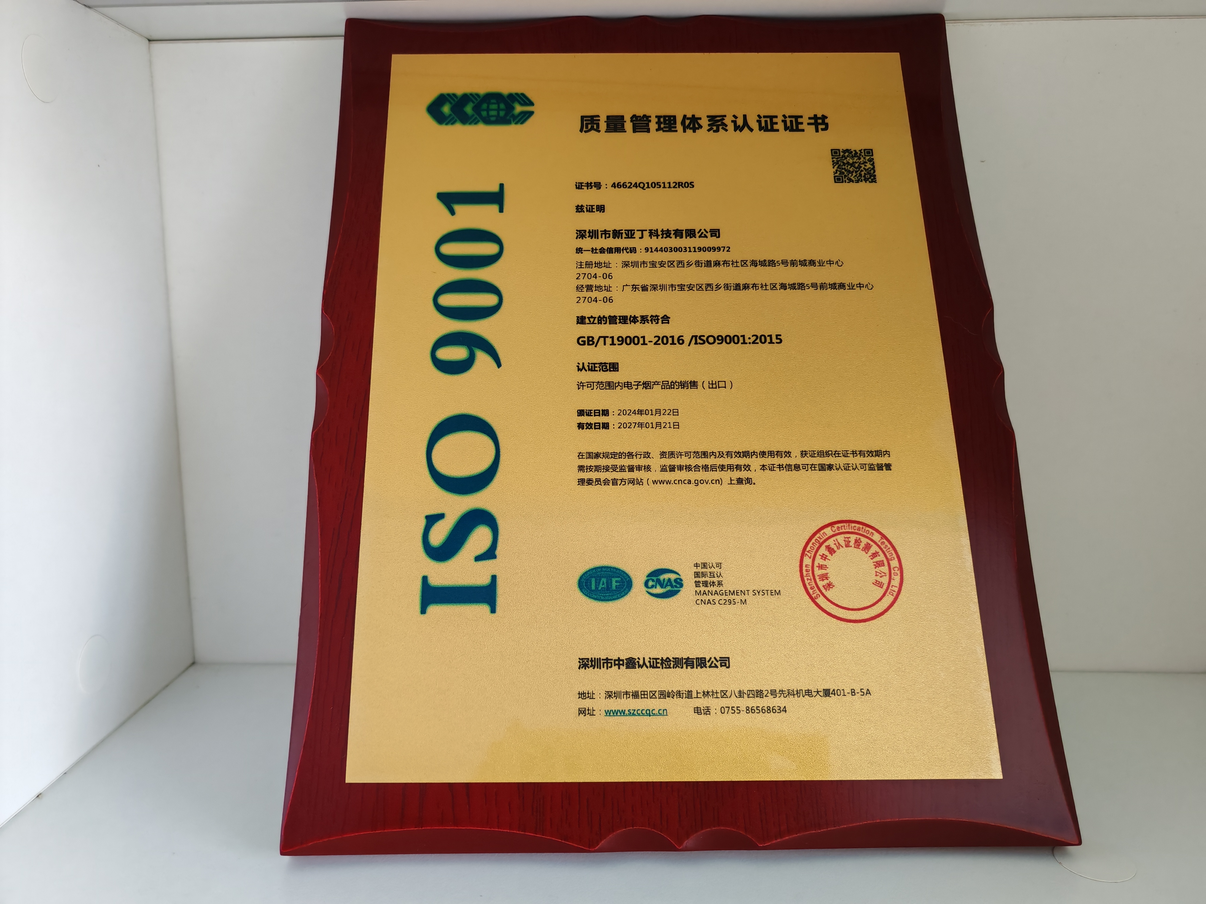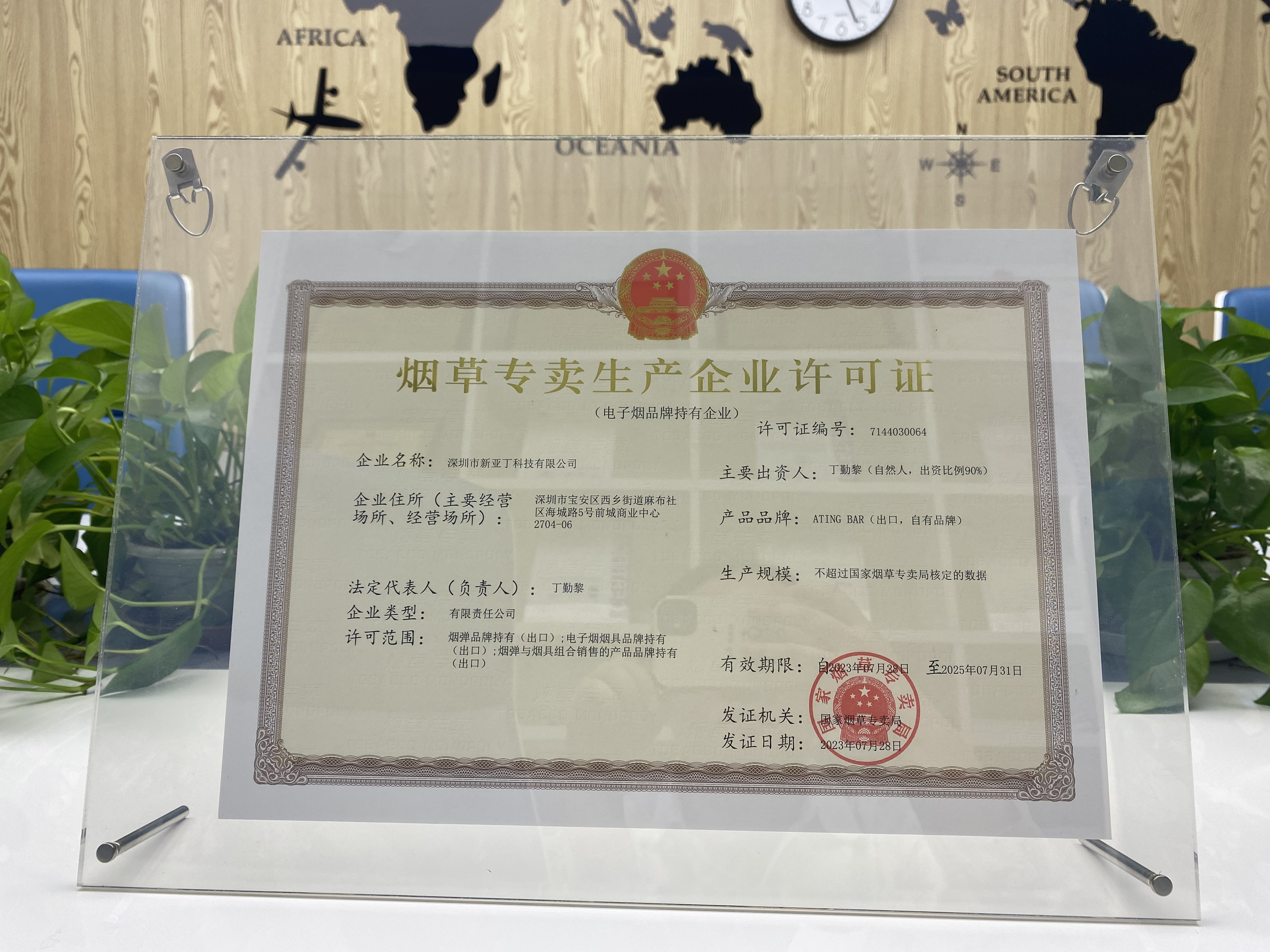 Als mehr 10 Jahre E-Zigaretten Hersteller, Atingbar erhalten mehr professionelle Produktionsqualifikationen. E-Zigaretten Herstellungserlaubnis ist Erste Schritte, Atingbar ist außerdem ein nationales innovatives kleines und mittleres Unternehmen und verfügt über eine ISO9001-Zertifizierung für das Qualitätsmanagementsystem. Atingbar ist außerdem Mitglied der Handelskammer für chinesische E-Zigaretten und wurde mit dem Titel „Hervorragende Marke in der Zerstäubungsbranche“ ausgezeichnet.