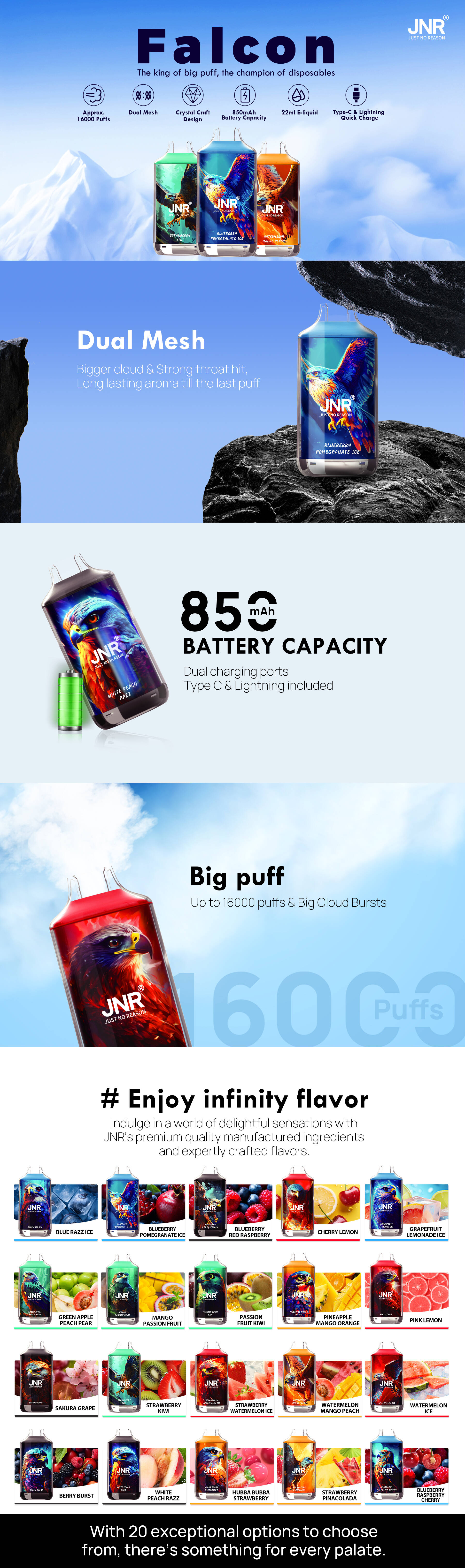 Die FALCON bietet ein unvergleichliches Dampferlebnis mit einer Kapazität von ca. 16.000 Zügen. Wählen Sie zwischen Nikotinstärken von 0–2 % und genießen Sie ununterbrochenen Dampfgenuss dank des 850-mAh-Akkus. Das elegante Kristall-Design und die Dual-Mesh-Technologie sorgen für außergewöhnlichen Geschmack und dichten Dampf. Mit einem großzügigen Tankvolumen von 22 ml bietet sie sowohl USB-C- als auch Lightning-Ladeoptionen für maximale Flexibilität.